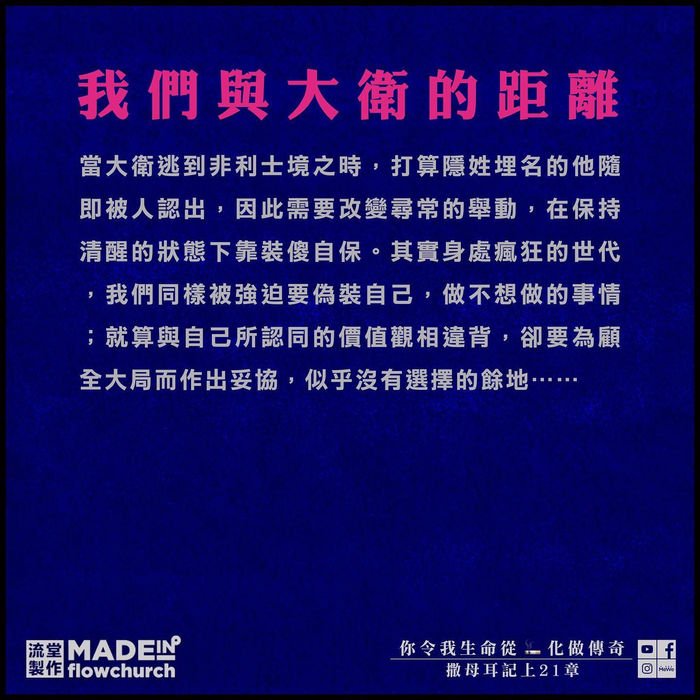 大衛可算是個經歷過高山低谷的傳奇人物,然而,人前人後作為英雄的他,背後卻有一段坎坷的歷史 — 無故得罪掃羅後,迫於無奈展開漫長的逃亡旅程,甚至成為連累別人家破人亡的罪魁禍首。一代王者竟如此潦倒,令祭司長亞希米勒不惜干犯律法,將陳設餅給予大衛充飢,更將當年擊殺歌利亞的刀交給大衛。不過,亞希米勒的惻隱之心,最後卻招致殺身之禍。