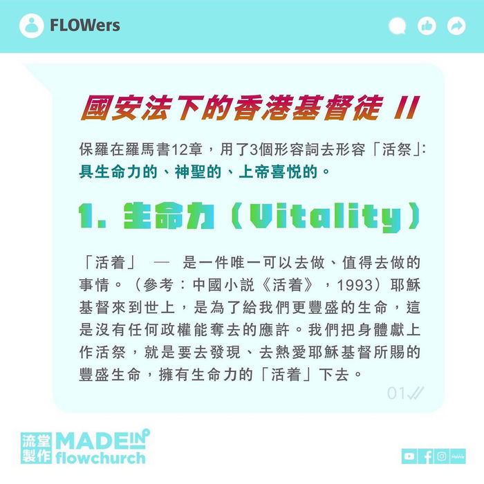 「活着」 — 是一件唯一可以去做、值得去做的事情。(參考:中國小說《#活着》,1993)耶穌基督來到世上,是為了給我們更豐盛的生命,這是沒有任何政權能奪去的應許。我們把身體獻上作活祭,就是要去發現、去熱愛耶穌基督所賜的豐盛生命,擁有生命力的「活着」下去。