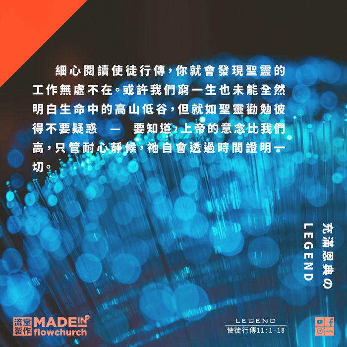 細心閱讀使徒行傳,你就會發現聖靈的工作無處不在。或許我們窮一生也未能全然明白生命中的高山低谷,但就如聖靈勸勉彼得不要疑惑 — 要知道,上帝的意念比我們高,只管耐心靜候,祂自會透過時間證明一切。